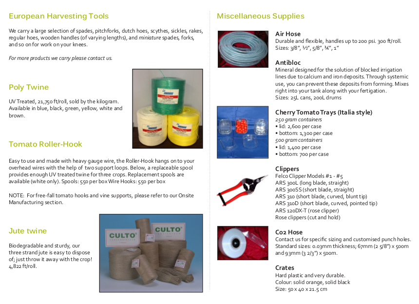 European Harvesting Tools, Poly Twine, Tomato Roller-Hook, and Jute Twine