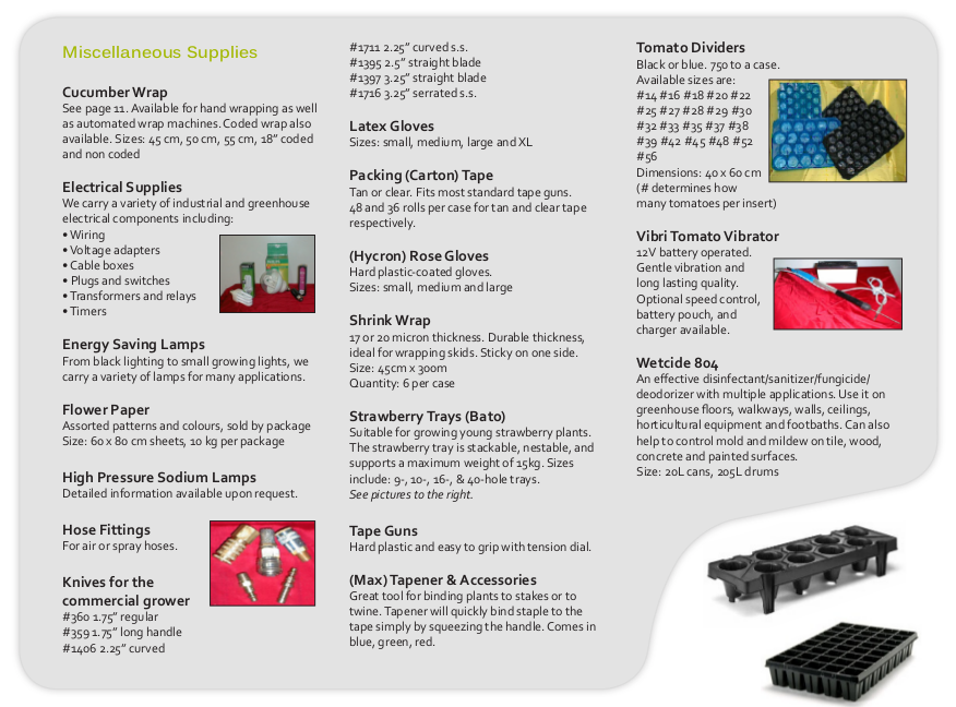 … We carry a wide range of essential greenhouse supplies such as paints, pots, measuring equipment, spraying devices, ground covers and much, much more. Below is a sample of the many products available from our extensive stock.