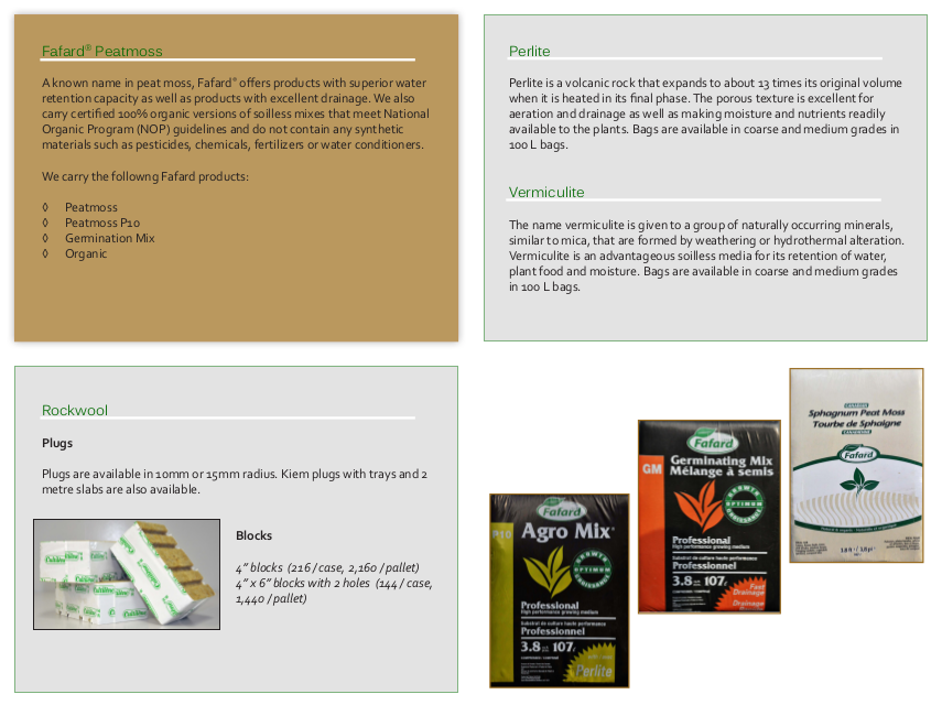 … You have built your greenhouse and furnished it with equipment and supplies but what will you grow your crop in? We offer Sri Lankan cocos, Fafard germination and soil mixes, rockwool, perlite, and vermiculte.