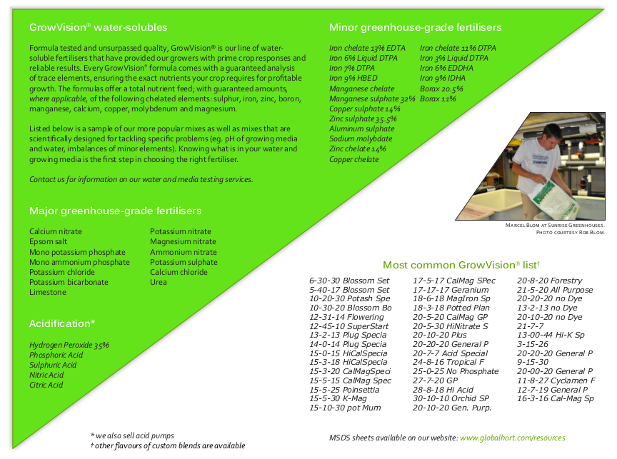 … We stock essential major and minor elements for successful plant growth as well as horticultural grade acids. We are proud to offer GrowVision®, our own line of water soluble fertilisers made in partnership with Plant Marvel®.