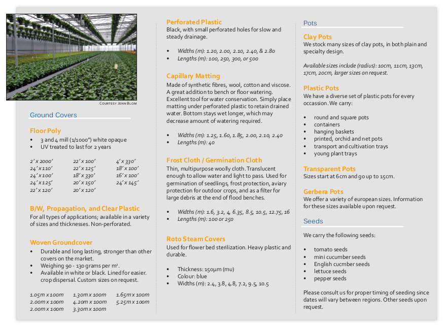 We aim to provide invaluable experience and inventory for all aspects of your greenhouse development. Starting from building a greenhouse (Greenhouse Supplies & Equipment) up until the final presentation of your product (Plant Care Tags). We call this overview: the evolution of your greenhouse. For more information, please download our catalogue by going to the Resources page or simply clicking on the image to the right (v.5 coming soon!).