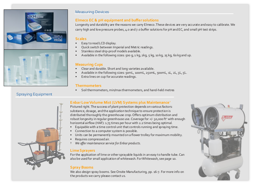 Elmeco EC & pH, Scales, Measuring Cups, Thermometers, Enbar LVM, Lime Sprayers, Spray Booms