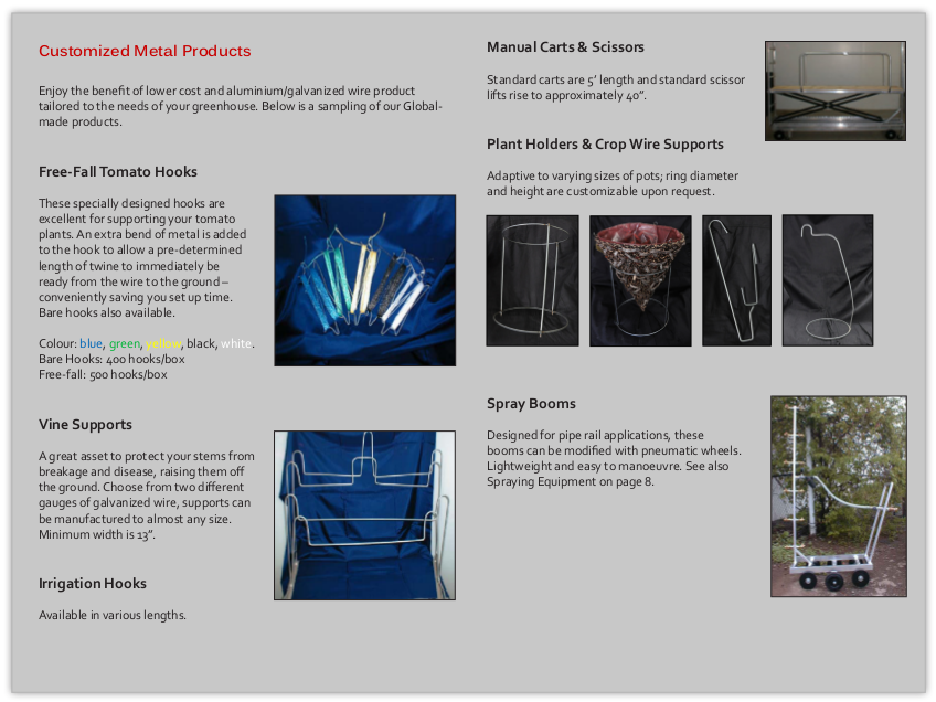 Free-Fall Tomato Hooks, Vine Supports, Irrigation Hooks (to size), Manual Carts & Scissors, Plant Holders & Crop Wire Supports, Spray Booms, and our newest product: Tall and Sturdy Tomato Cages